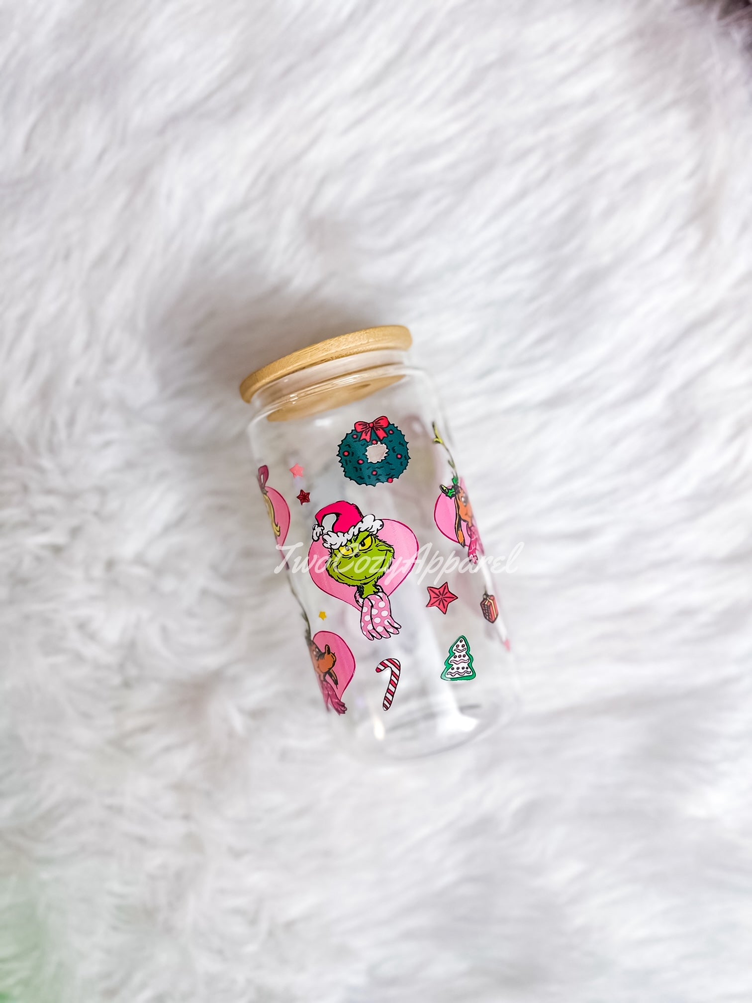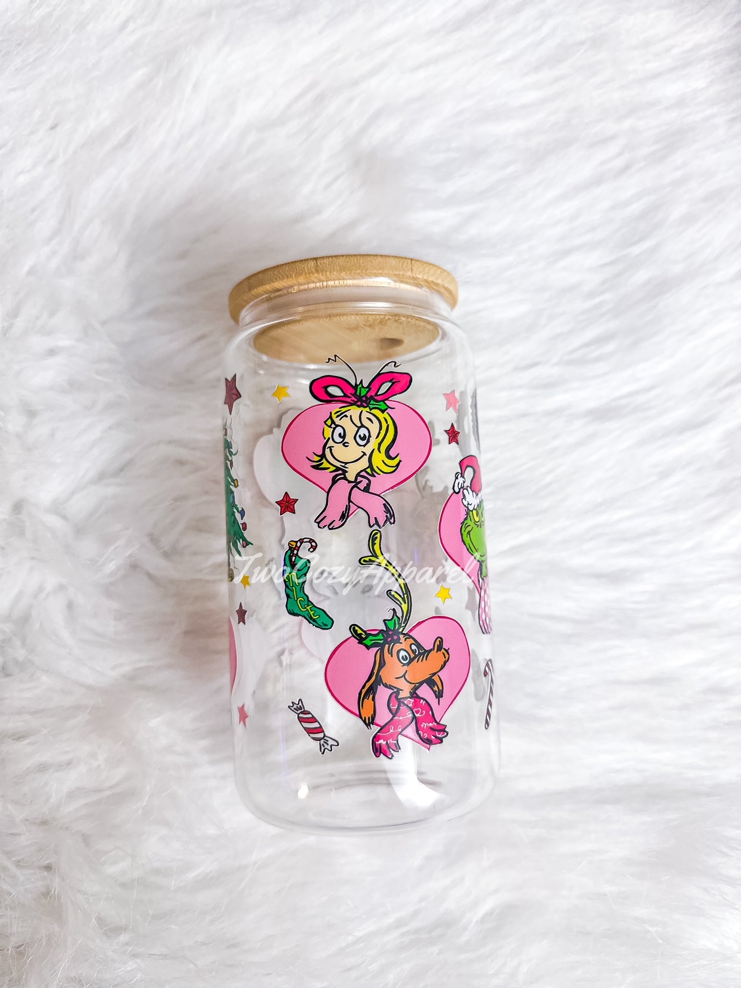16 oz Glass cups with Bamboo Lid and plastic straw.
