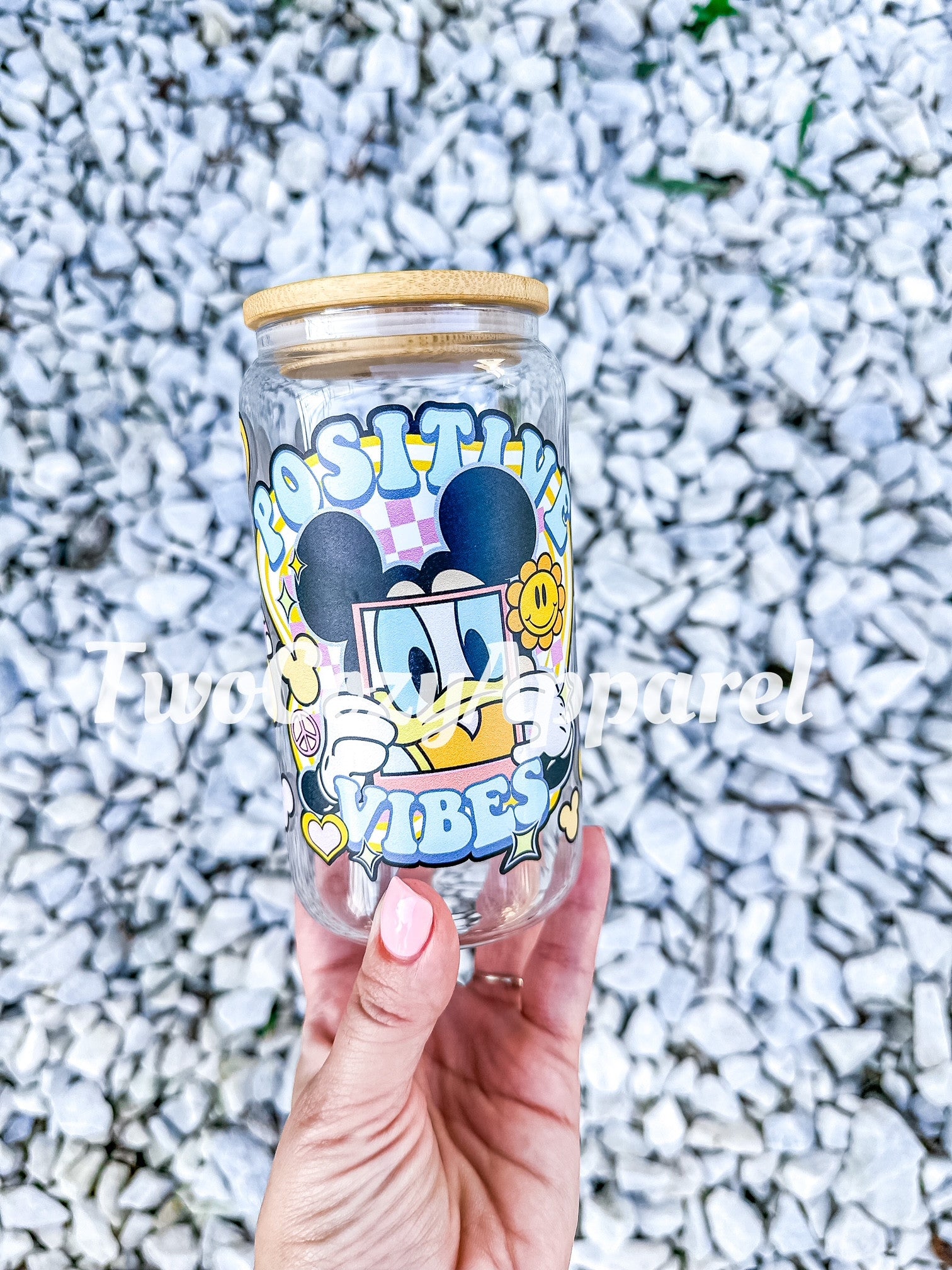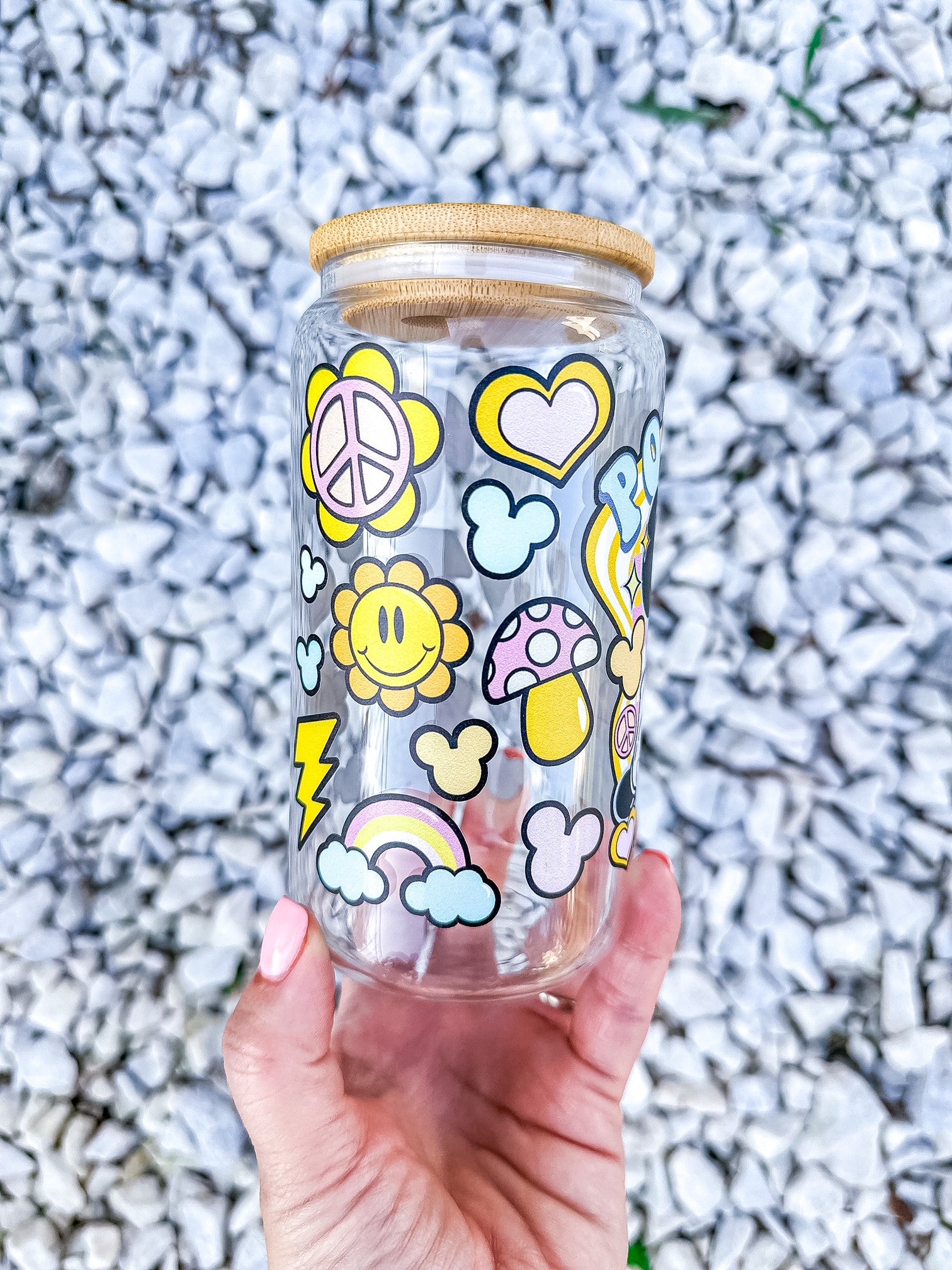 16 oz Glass cups with Bamboo Lid and plastic straw.