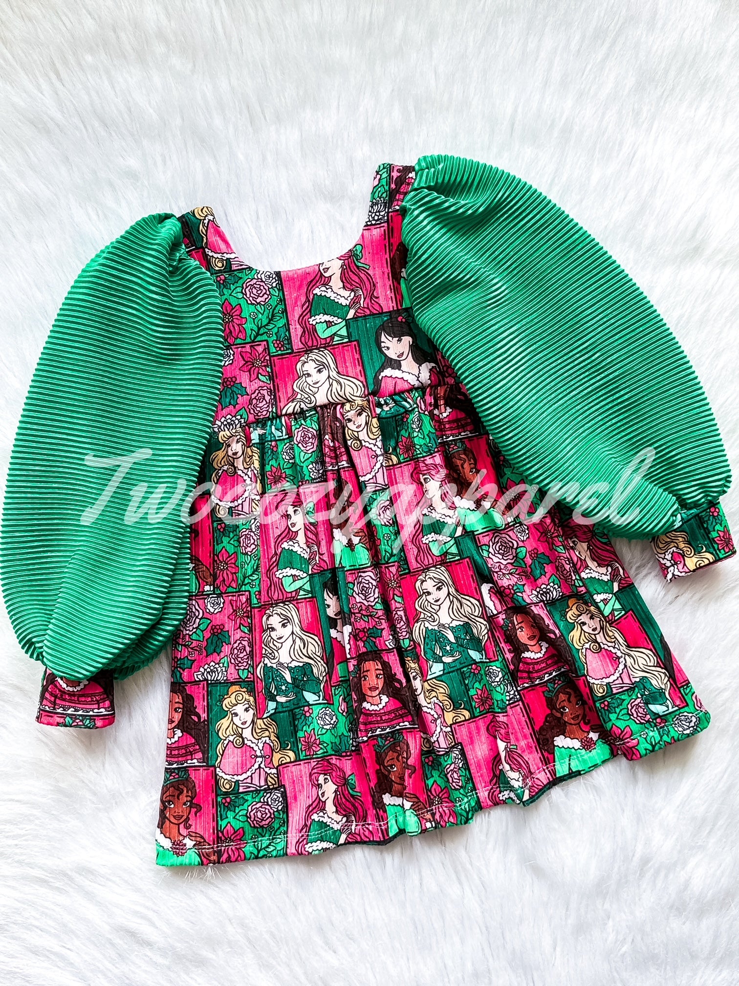PLEASE BE ADVISED I WILL USE THE GREEN FABRIC FOR OUR XMAS PRINCESS PRINT JUST AS PICTURED. I WILL USE A COORDINATED SOLID COLOR FABRIC FOR OUR PETAL SLEEVE OF MY CHOICE TO MATCH FOR ANY OTHER FABRIC CHOSEN