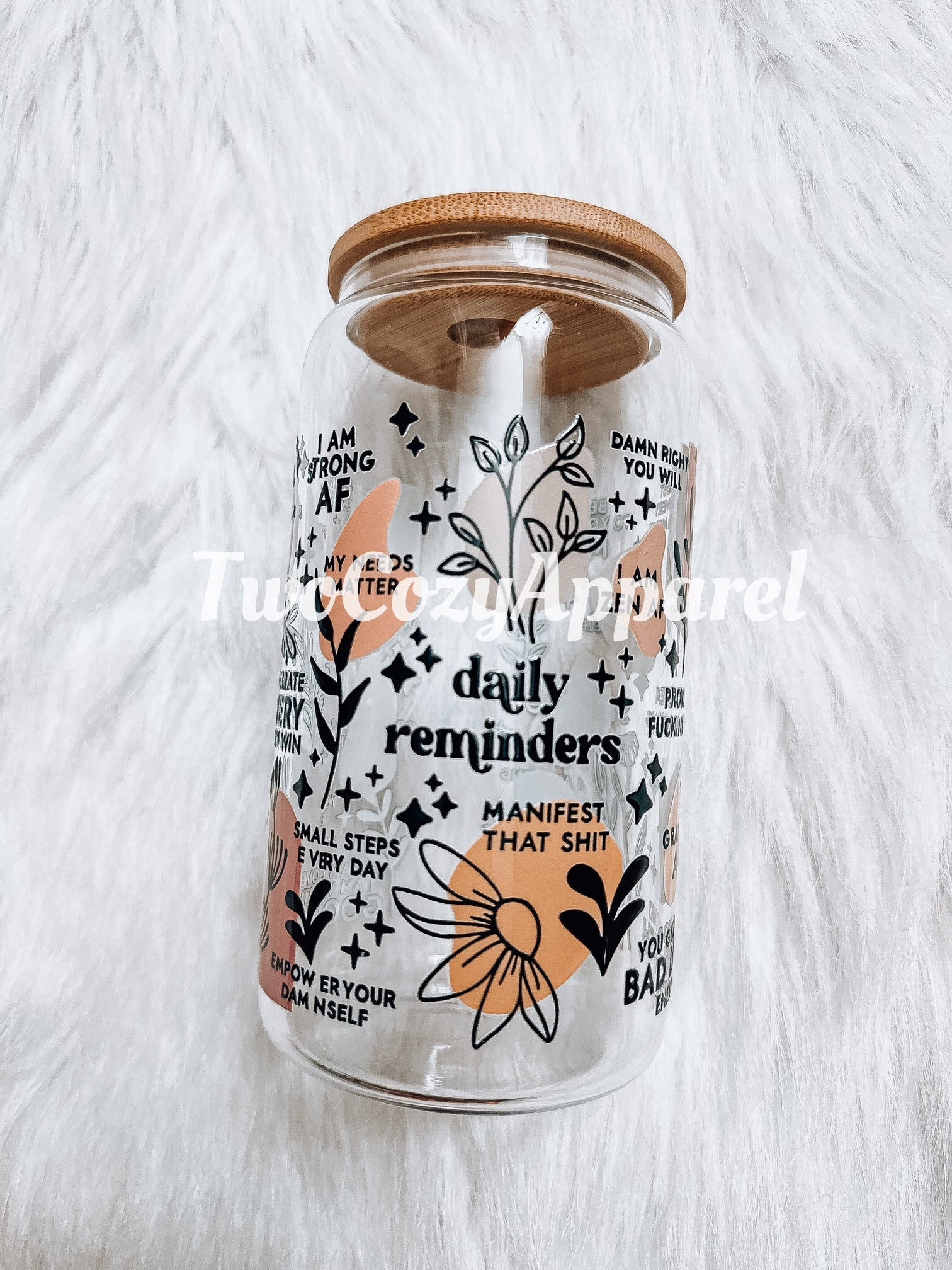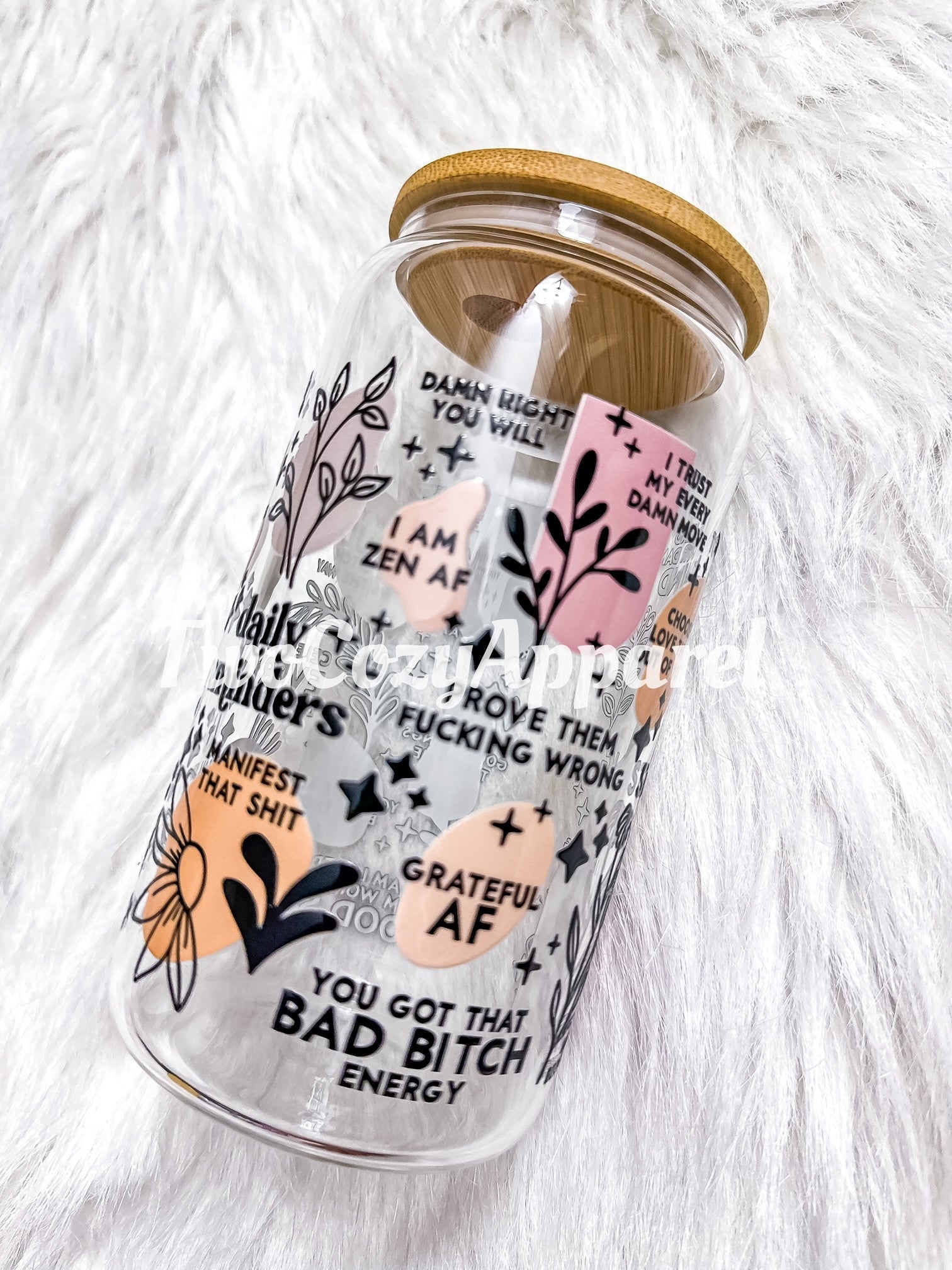 16 oz Glass cups with Bamboo Lid and plastic straw.
